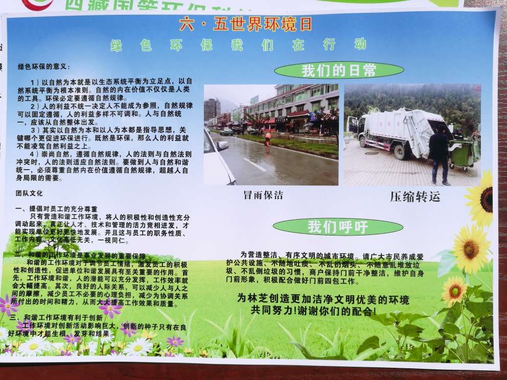 2017年6月5日,在林芝市巴宜區(qū)廈門廣場開展《六五世界環(huán)境日》環(huán)保宣傳活動(dòng),——“青山綠水便是金山銀山”,呼吁廣大市民、游客等廣大群眾參與保護(hù)雪域高原最后的碧水藍(lán)天;此次活動(dòng)由林芝市環(huán)保局牽頭組織舉辦,參與活動(dòng)單位:林芝市市政管理局、西藏國策環(huán)??萍脊煞萦邢薰玖种シ止?、林芝市農(nóng)牧局、林芝市國土資源局、林芝市發(fā)改委、中國華能、巴宜區(qū)環(huán)保局、林芝市商務(wù)局、林芝市科技局、林芝市林業(yè)局等單位。活動(dòng)現(xiàn)場也聚集市民、游客等參與環(huán)保宣傳和學(xué)習(xí)環(huán)保知識。