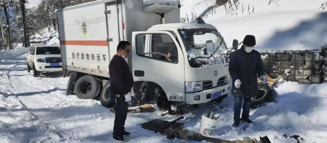 圖為國策環(huán)保醫(yī)療廢物轉(zhuǎn)運車在轉(zhuǎn)運醫(yī)療垃圾途中,因天氣惡劣車體打滑故障,車輛被困,正在進行維修。